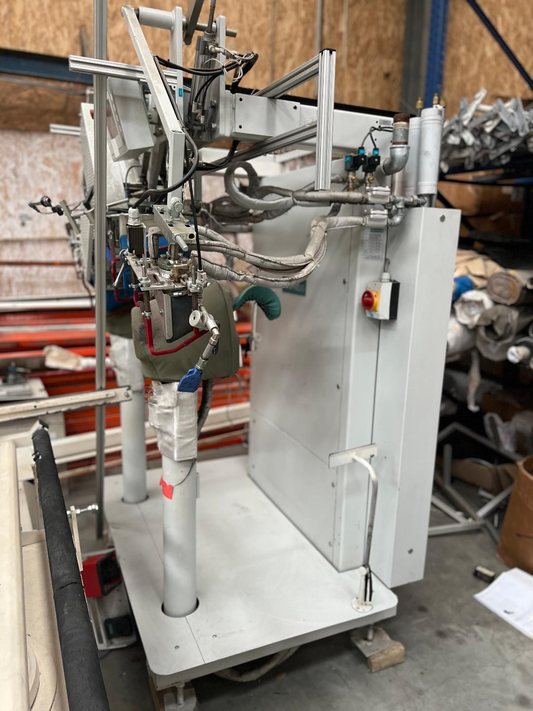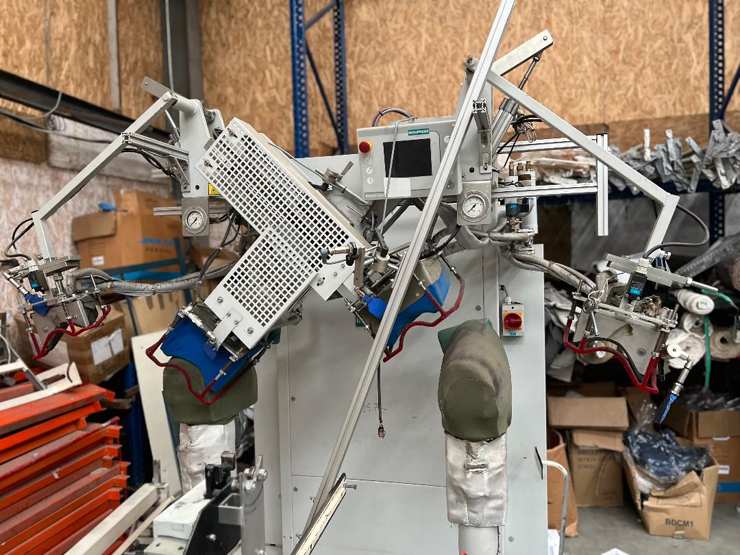 Pressing machine for fusing in of shoulder pads and form-pressing of shoulder with devided upper shapes and three adjustment possibilities for different sizes (widths) of shoulder pads